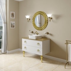 2. Раковины из Стекла или Стеклокерамики – моноблок собственного про-ва устанавливаются на ряд тумб от 80 см и более. Для коллекции BOURGET идеально подходят стеклянные раковины с покрытием золотой или серебряной поталью, которые предлагаются на выбор из наличия.