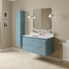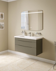 Основу коллекции составляют подвесные тумбы четырех типоразмеров, которые венчают керамические раковины. Ассортиментный перечень серии дополняет вместительный и функциональный подвесной шкаф-пенал. Рекомендованные зеркала для коллекции – серии зеркал ТЕХНО-М и МОДЕРН с LED- подсветкой и сенсорным выключателем.