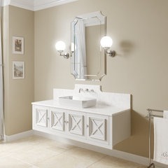 1. Столешницами с врезными, подвесными керамическими раковинами. Оптимальная толщина столешницы не должна превышать 20 мм. В связи с этим в качестве столешниц для коллекции TIBET оптимально использовать Кварцевый агломерат 20 мм. Столешницы из натурального мрамора или мраморного агломерата довольно хорошо подходят по стилю. Они также предлагаются для использования в коллекции.
