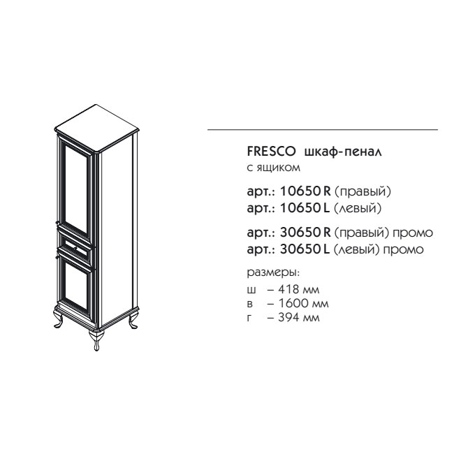 Шкаф-пенал Fresco левый производится в отделке В016 в комплекте: один выдвижной ящик и две стеклянные полки 4 м