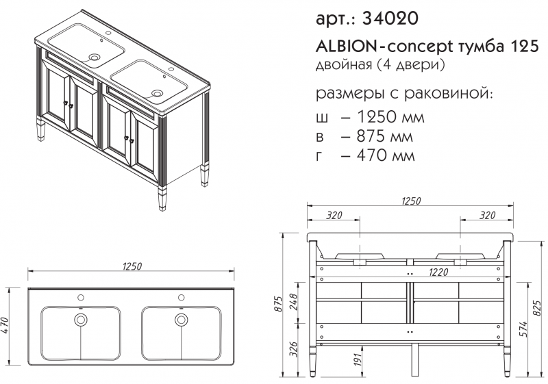 ALBION concept тумба 125 двойная (4 двери) производится под заказ в любых отделках "SOFTTOUCH" из реестра отделок CONCEPT Двойная раковина фаянс продается отдельно