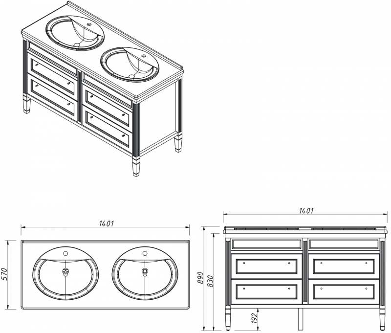 ALBION тумба для столешницы 140см двойная, четыре ящика со столешницей выпускается в отделках: из Реестра отделок мебели CLASSIC. Четыре выдвижных ящика. Различные варианты врезных раковин(фаянс) и столешниц.