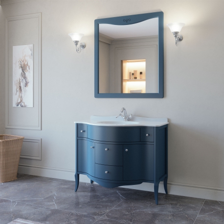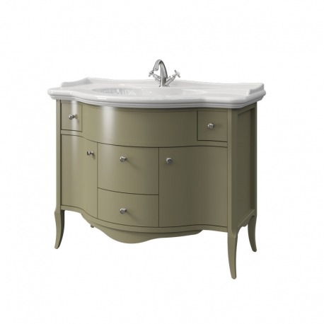 Тумба в ванную с раковиной MODENA 110 выпускается в отделках из Реестра отделок Classic без патинирования. Раковина фаянс или стекло. Четыре выдвижных ящика (два верхних без направляющих) две стеклянные полки 4 мм.
