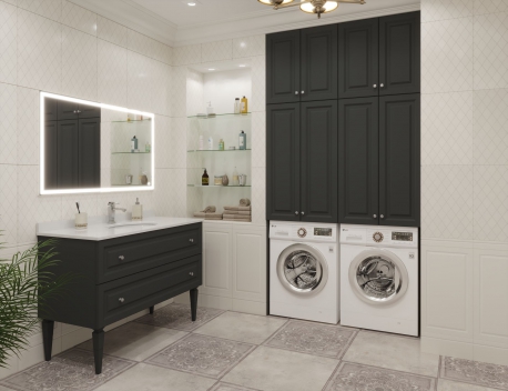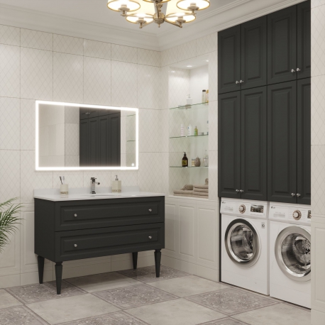 Артикул:Пример ванны в системе BASIS с универсальный фасадом Kent и отделкой Графит. Цена мебели без столешницы, раковины, смесителя, зеркала, светильников