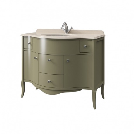 Тумба в ванную с раковиной и столешницей MODENA 110 выпускается в отделках из Реестра отделок Classic без патинирования. Столешница из мрамора, кварца или агломерата. Врезная раковина из фаянса. Четыре выдвижных ящика (два верхних без направляющих) две стеклянные полки 4 мм.