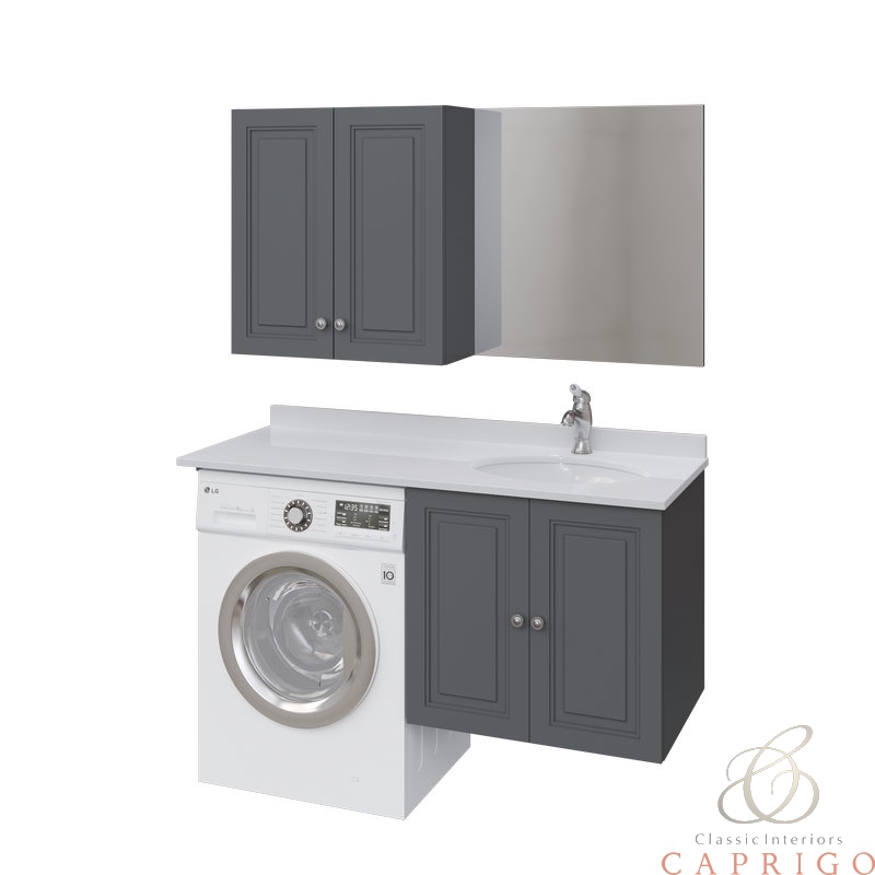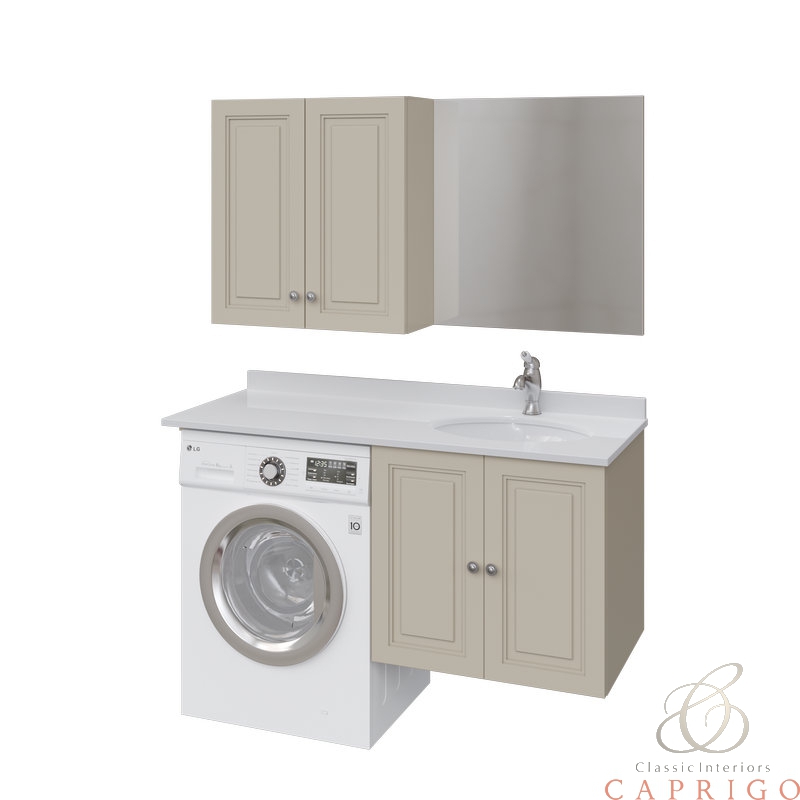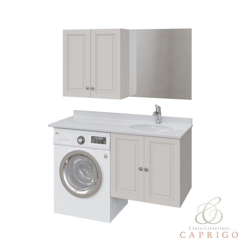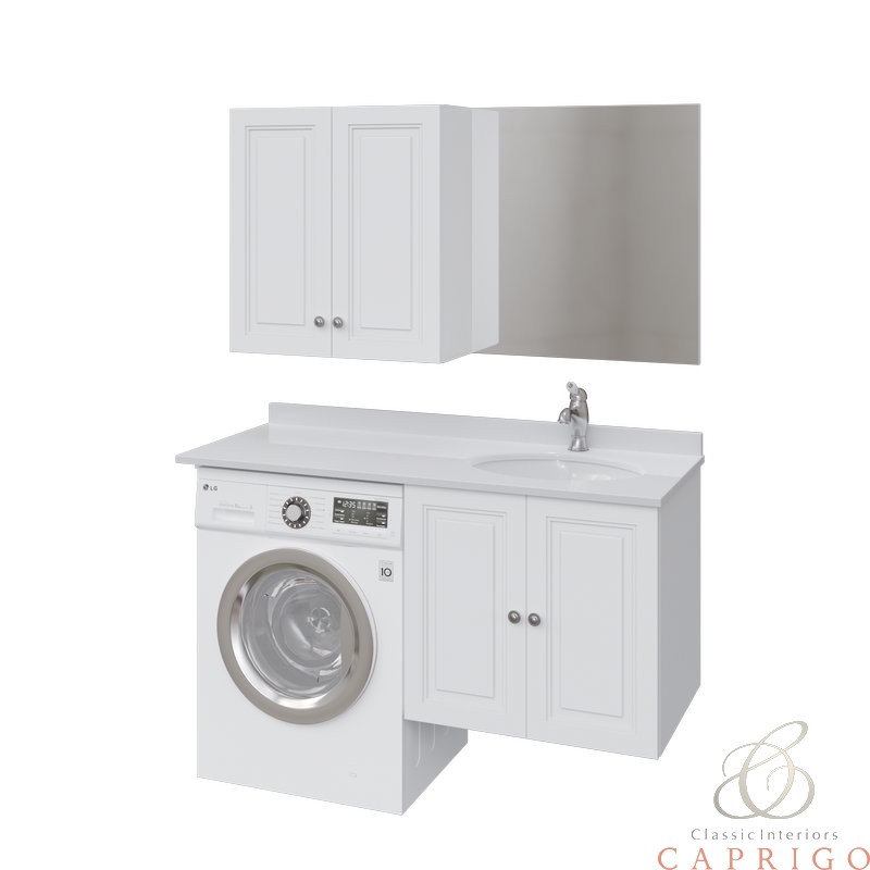 Единая бесшовная столешница из кварцевого камня Кристал Бьянко CAPRIGO скрывает поверхность стиральной машины от глаз и внешнего воздействия влаги на корпус, при этом добавляет широкую рабочую зону, и сохраняет эстетические качества интерьера.