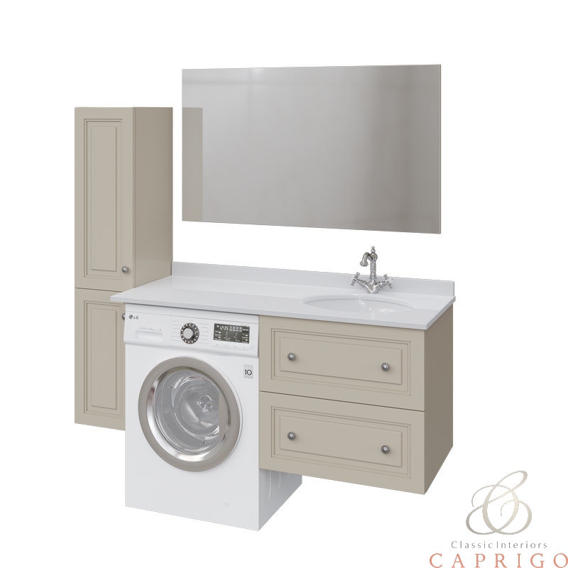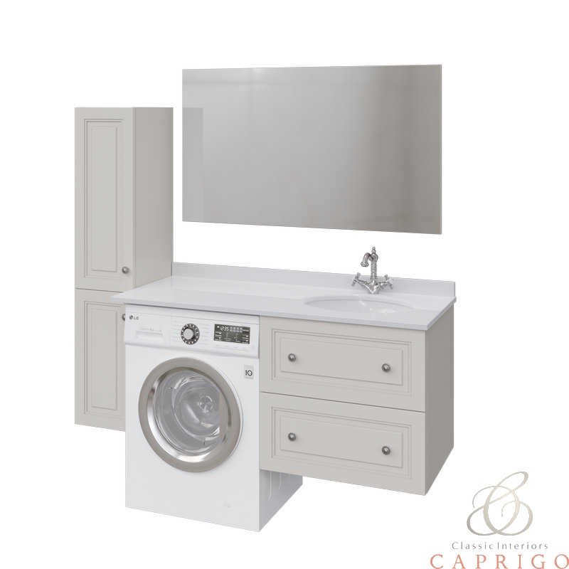 Единая бесшовная столешница из кварцевого камня Кристал Бьянко CAPRIGO скрывает поверхность стиральной машины от глаз и внешнего воздействия влаги на корпус, при этом добавляет широкую рабочую зону, и сохраняет эстетические качества интерьера.