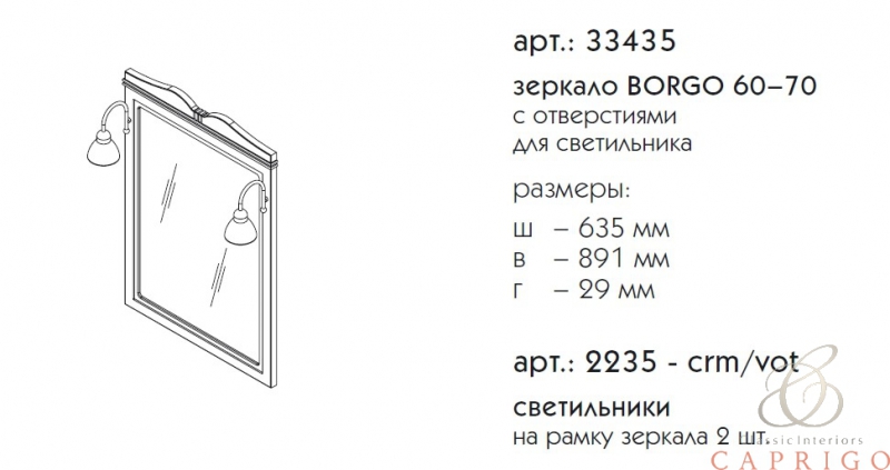 Зеркало BORGO 60 70 см станет отличным украшением Вашей ванны. Выпускается под заказ в отделках Эмалями из Реестра CLASSIC. Без фацета. В цену светильники не включены.