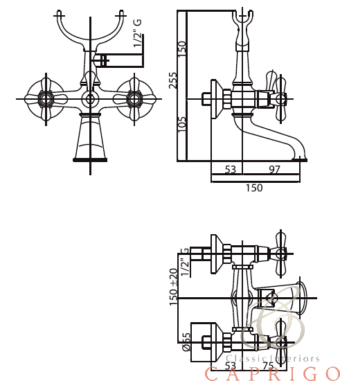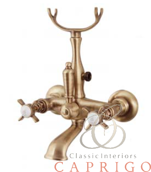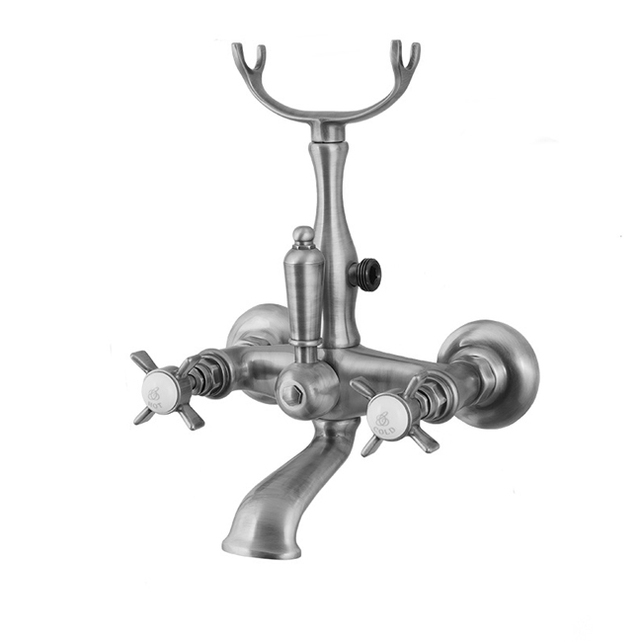 настенный смеситель для ванной с подставкой для лейки БЕЗ душевого набора (шланг+лейка) керамические кранбуксы 180', металлические, стилизованные под крест рукоятки