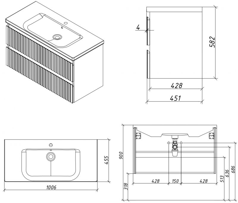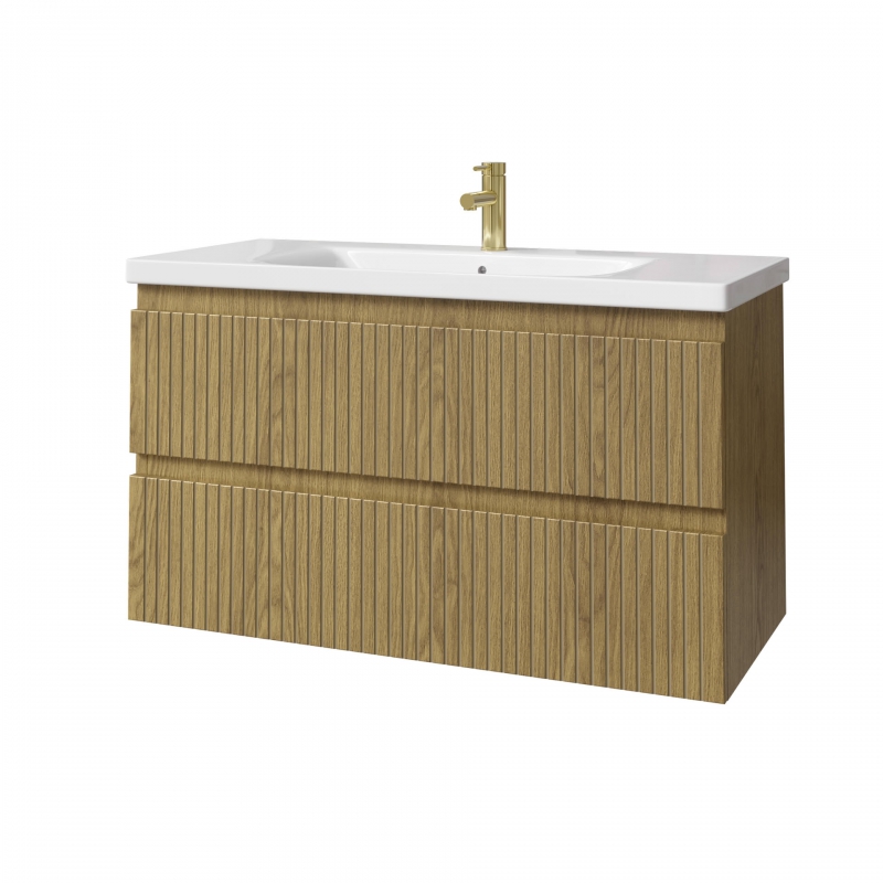 Тумба подвесная для раковины 100см с 2 ящиками. С фрезеровкой на фасадах. Выпускается в отделках Натуральным Шпоном.