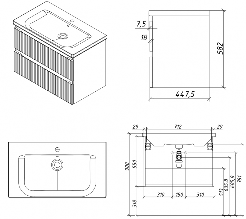 Тумба подвесная для раковины 80см с 2 ящиками. С фрезеровкой на фасадах. Выпускается в Эмалях из реестра CLASSIC.