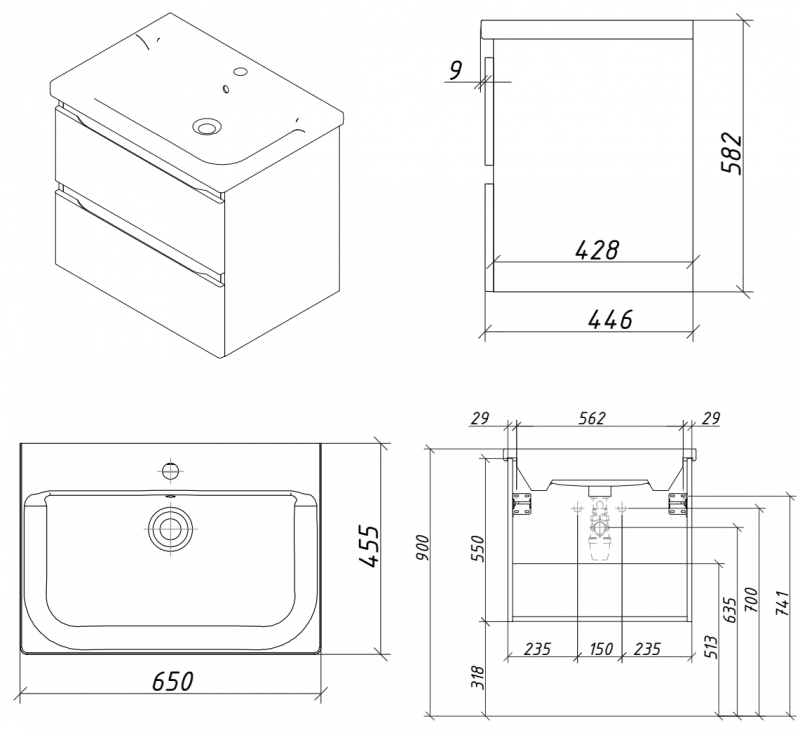 Тумба подвесная FORTE 65 для раковины 65см с 2 ящиками. Ручки интегрированные в фасадах. Выпускается в Матовых и Текстурированных отделках из реестра MODERN (ограничение по глянцевым отделкам).