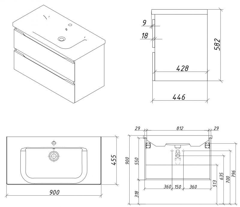 Тумба подвесная для раковины 90см с 2 ящиками. Ручки интегрированные в фасадах. Выпускается в Эмалях из реестра CLASSIC