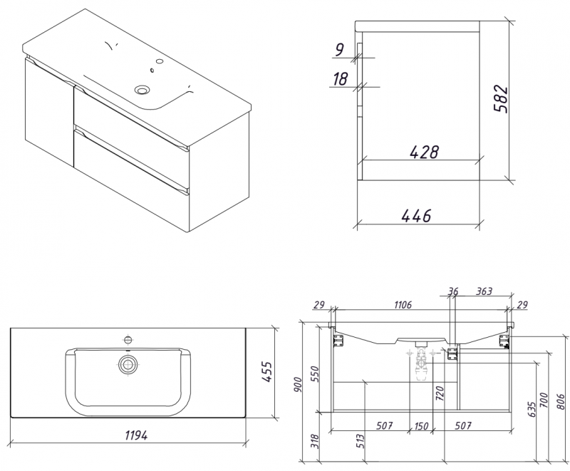 | Габаритные размеры тумба + раковина, ш/г/в, в см: | 119,4/ 45,5/ 58,2 |