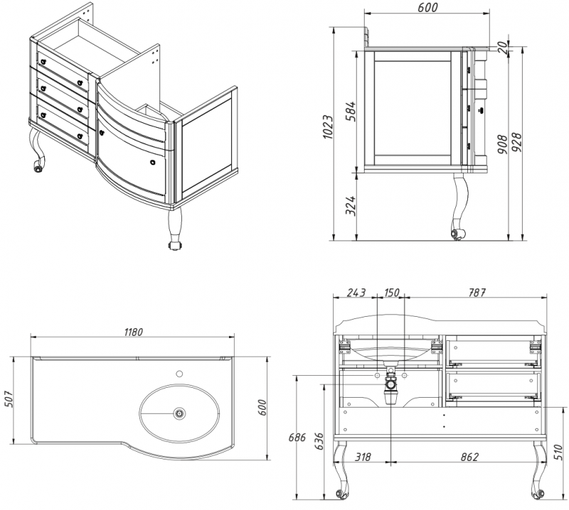 | Габаритные размеры тумба + раковина, ш/г/в, в см: | 117/58,8/90,8 |