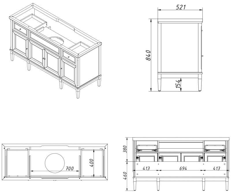 Тумба для столешницы 150см, 2ящ.4двери, выпускается в отделках из Реестра отделок CLASSIC. Варианты раковин(фаянс)арт. 0222WK;540WK;1441-540G;1427-540N;Сева DUO, отдельно заказывается столешница