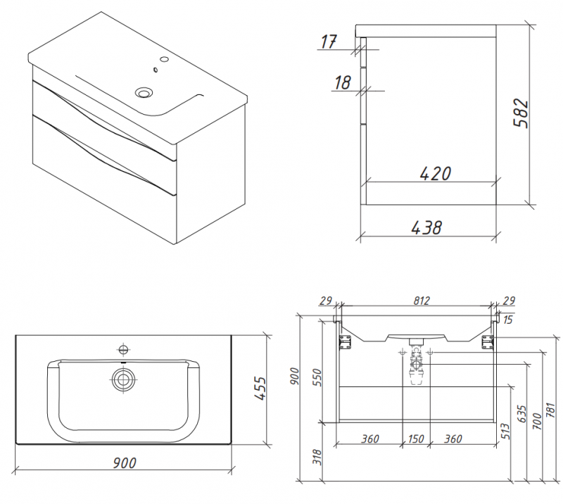 Тумба подвесная для раковины 90см с 2 ящиками. Ручки интегрированные в фасадах. Выпускается в Эмалях из реестра CLASSIC.