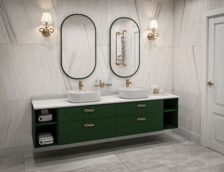 BASIS под заказа c плоским фасадом и зелёной отделкой. Цена мебели без столешницы, раковины, смесителя, зеркала и светильников
