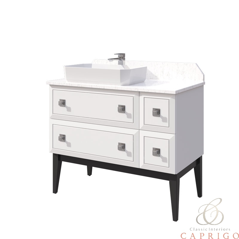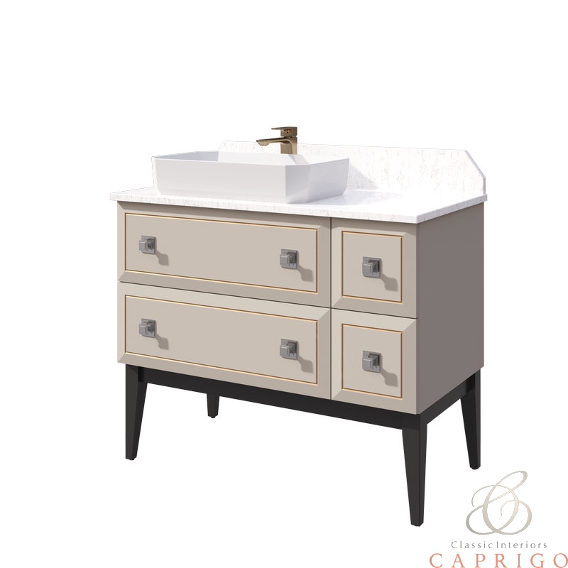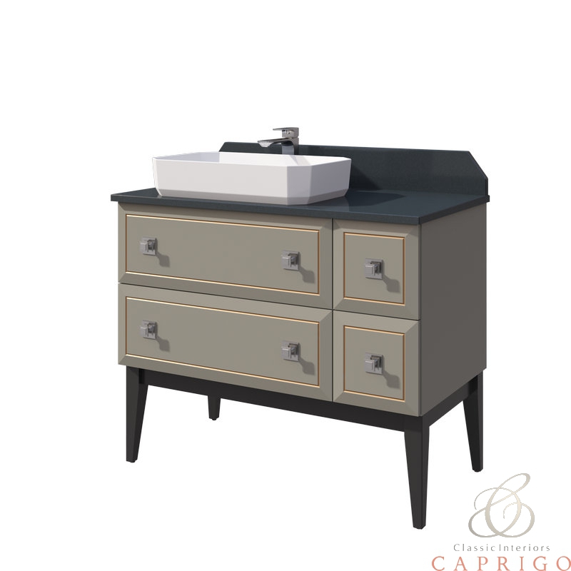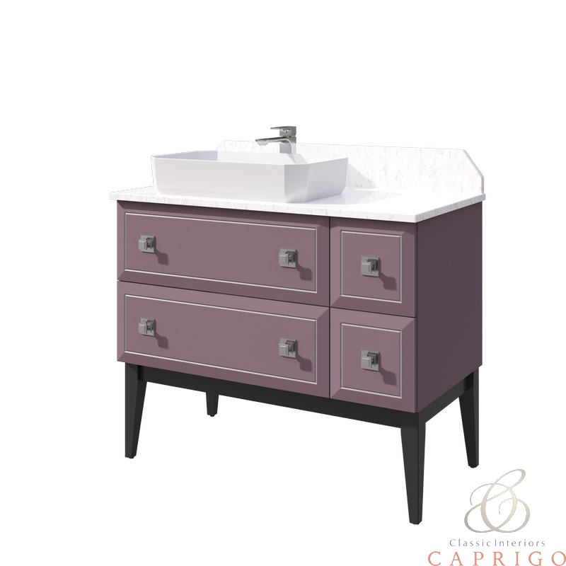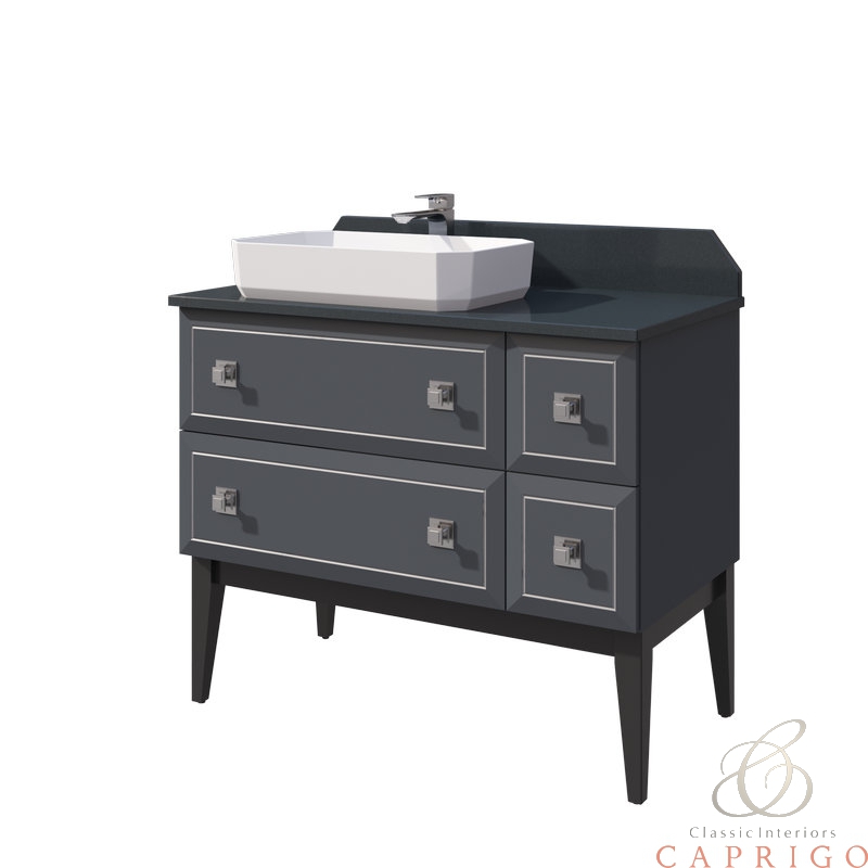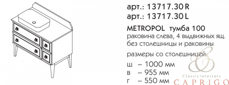 METROPOL тумба 100 с накладной раковиной слева выпускается в отделках: категория ЭМАЛИ –SPECIAL ENAMEL category реестра отделок "CLASSIC" варианты накладных раковин (фаянс) Sanita Luxe LINE или AMPIR. Тип столешниц на выбор: Искусственный камень CAPRIGO-White или Кварцевый агломерат SILESTONE или Мраморный агломерат SantaMargherita или Натуральный мрамор