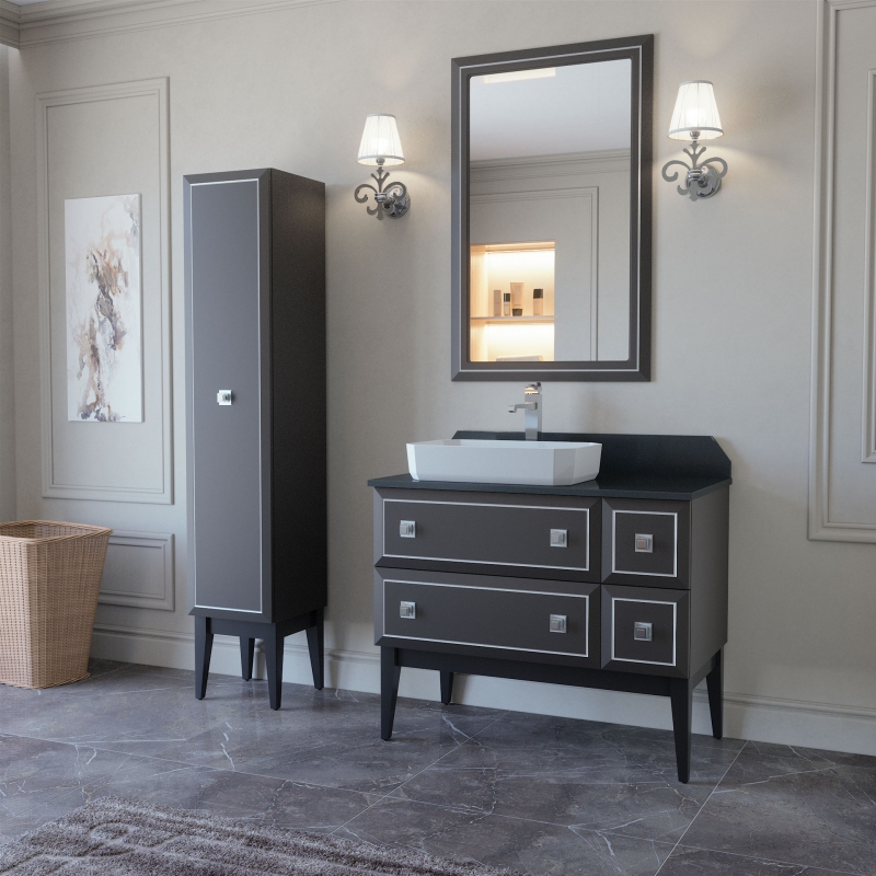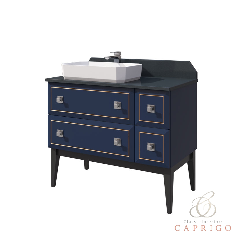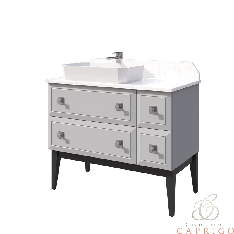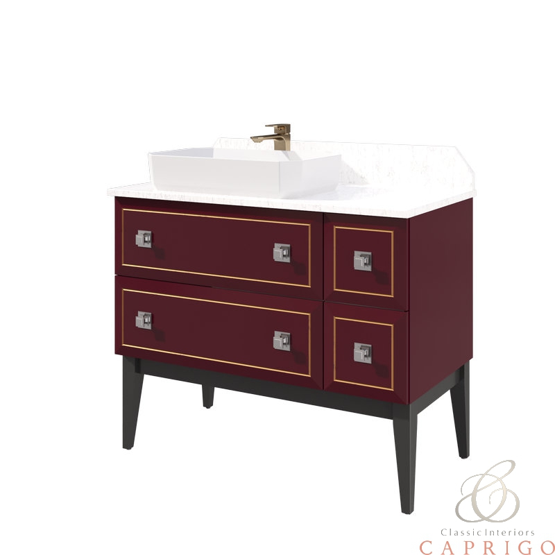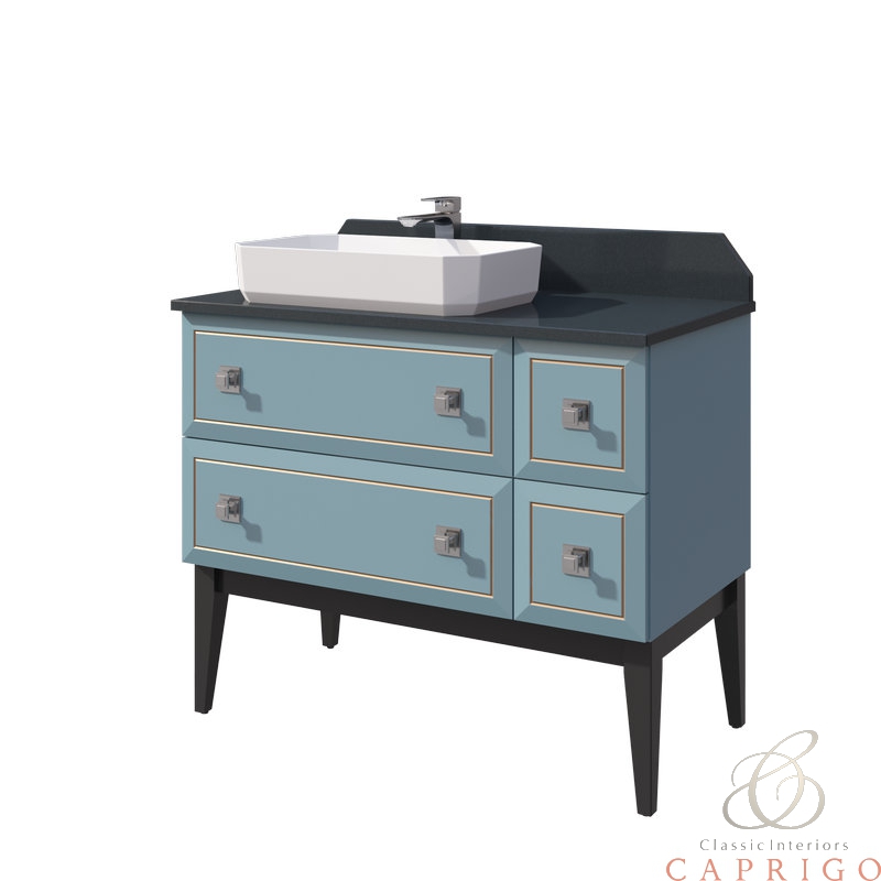 METROPOL тумба 100 с накладной раковиной слева выпускается в отделках: категория ЭМАЛИ –SPECIAL ENAMEL category реестра отделок "CLASSIC" варианты накладных раковин (фаянс) Sanita Luxe LINE или AMPIR. Тип столешниц на выбор: Искусственный камень CAPRIGO-White или Кварцевый агломерат SILESTONE или Мраморный агломерат SantaMargherita или Натуральный мрамор