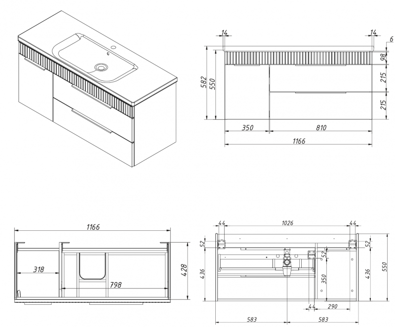 Тумба подвесная для раковины 120см с 2 ящ.и и 1 дверью. Выпускается в отделках Натуральным Шпоном.