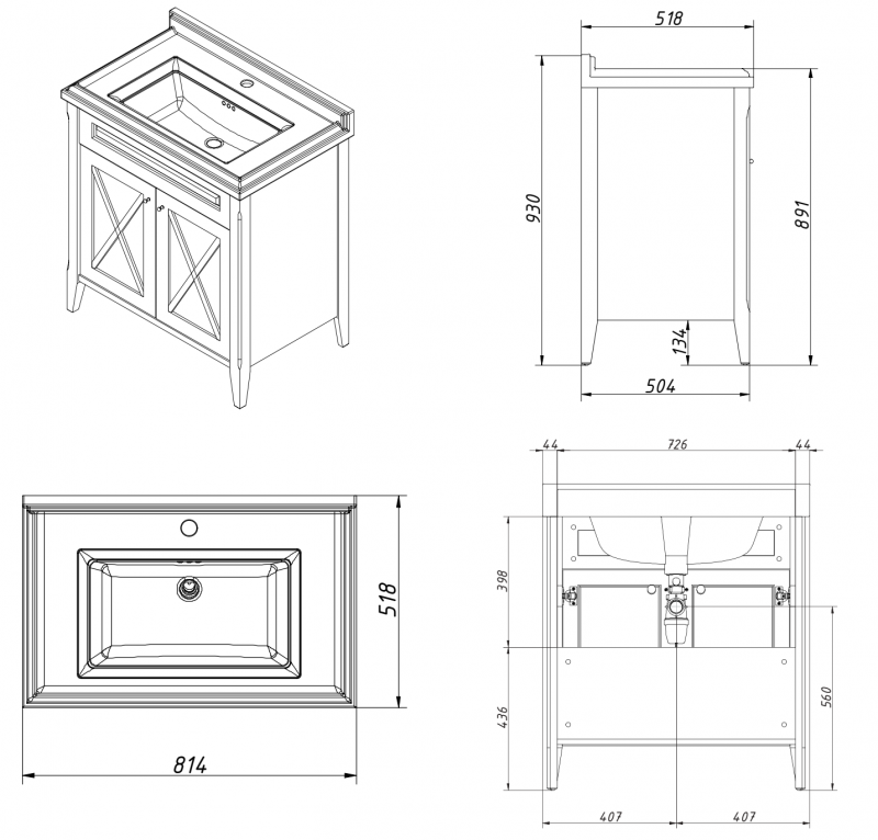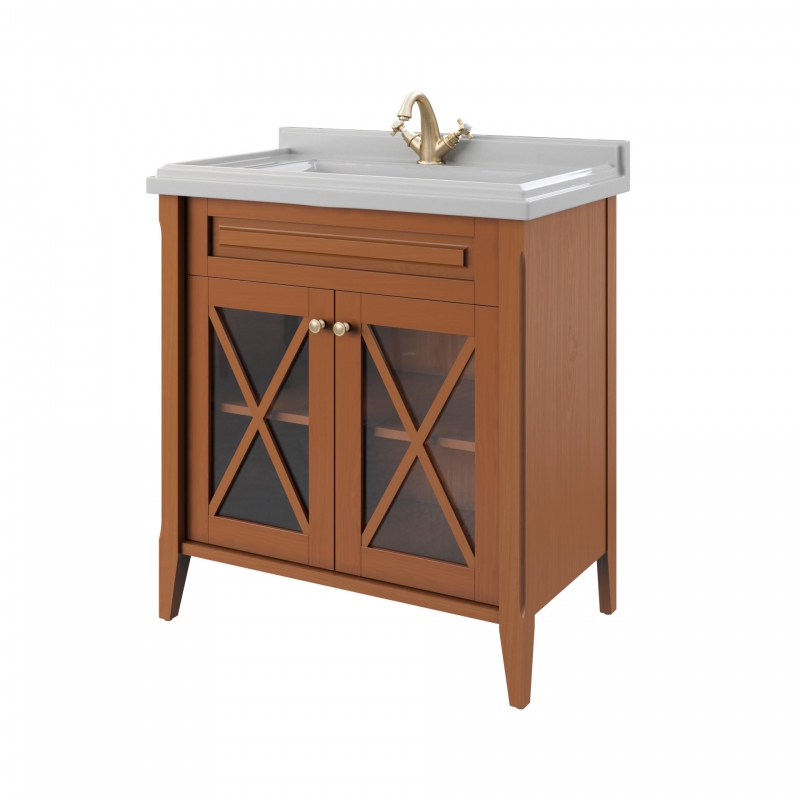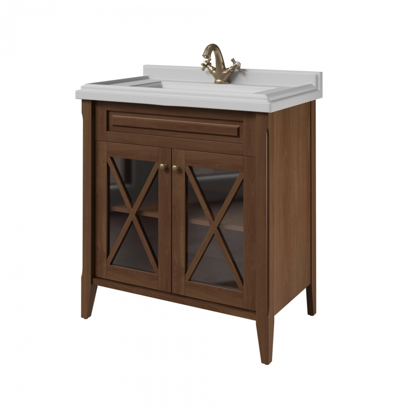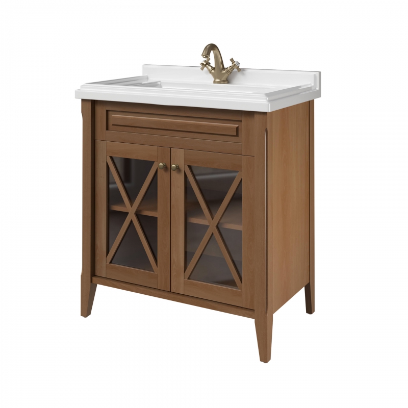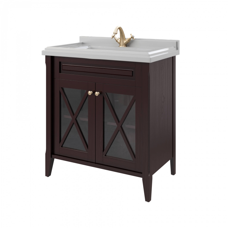 Тумба для раковины 80см с 2 дверьми. Внутри одна полка. Фасады со стеклом. Выпуск только в отделкев отделках 036 NOCE antico, 038 NOCE europea, 075 NOCE GVAR из реестра CLASSIC.