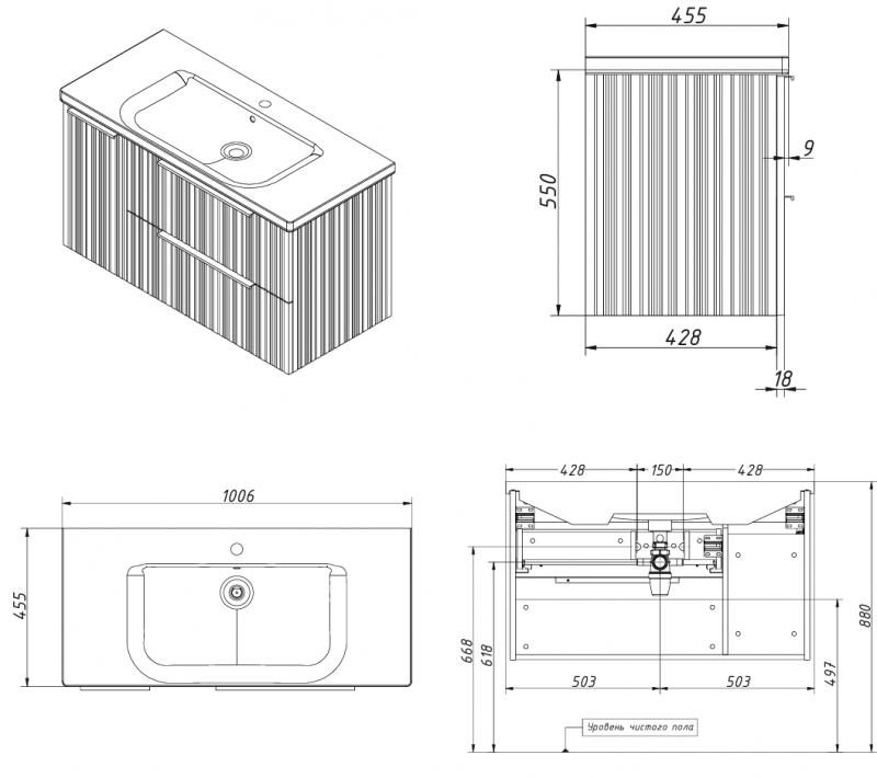 Тумба подвесная для раковины 100см с 2 ящ.и и 1 дверью. Фреза на фасадах и боках. Выпускается в Эмалях из реестра CLASSIC.