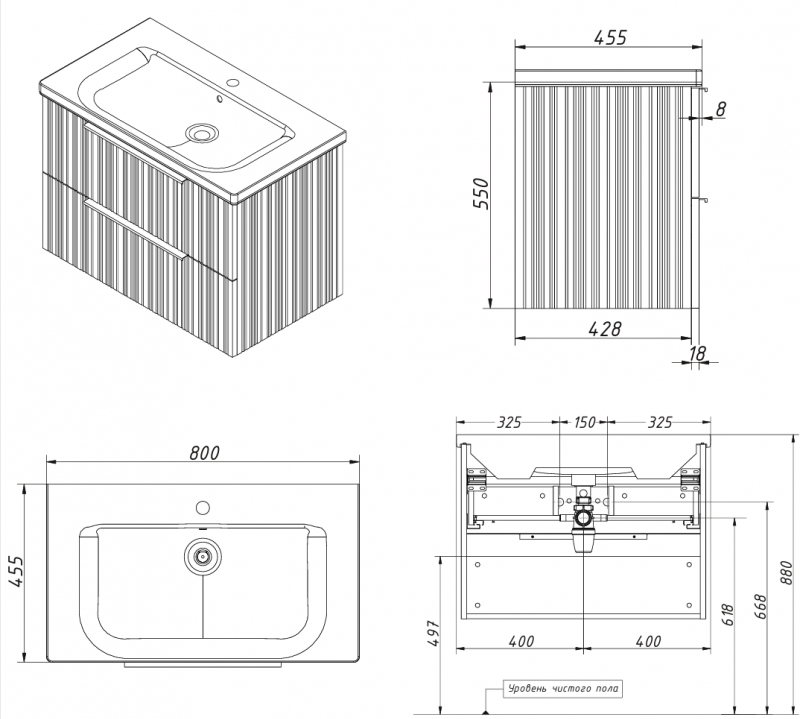 Тумба подвесная для раковины 80см с 2 ящиками. Фреза на фасадах и боках. Выпускается в Эмалях из реестра CLASSIC.