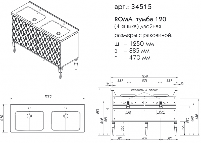 ROMA тумба 120 (4 ящика) двойная в ванную комнату производится под заказ в любых отделках "SOFTTOUCH" из реестра отделок CONCEPT. Раковина отдельно