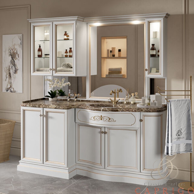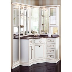 Для формирования комплекта пространство ванной комнаты заполняется по периметру необходимыми модулями. Тумбы и шкафы устанавливаются на основание (цоколь) и накрываются единой столешницей. Над тумбами, в необходимом порядке подвешиваются зеркальные модули и навесные шкафчики. Венчает композицию фигурный карниз, в который монтируются по желанию мебельные светильники.