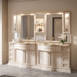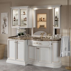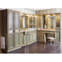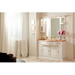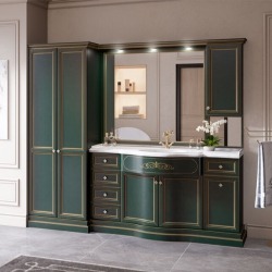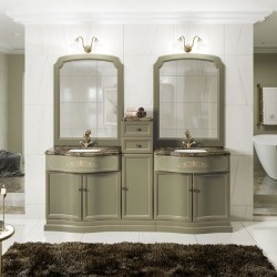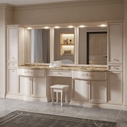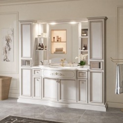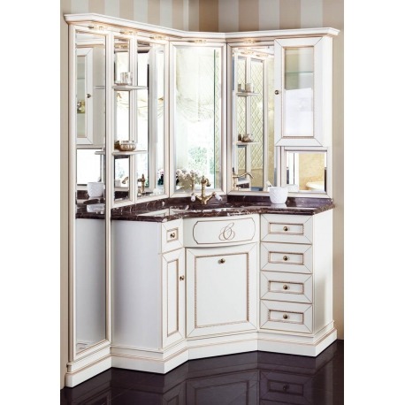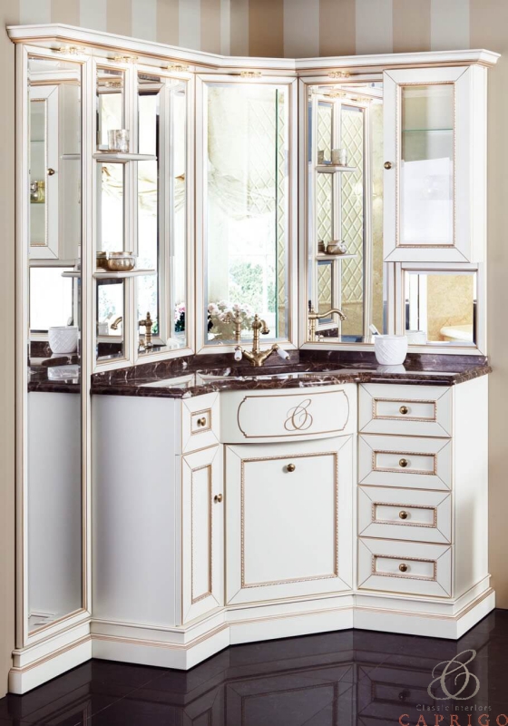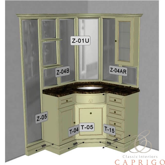модель Spazio, КОМПОЗИЦИЯ - 5 как пример компизиции Коллекции SPAZIO classico. Для формирования комплекта пространство ванной комнаты заполняется по периметру необходимыми модулями. Тумбы и шкафы устанавливаются на основание (цоколь) и накрываются единой столешницей. Над тумбами, в необходимом порядке подвешиваются зеркальные модули и навесные шкафчики. Венчает композицию фигурный карниз, в который монтируются по желанию мебельные светильники. Для точности и удобства составления комплектов мебели SPAZIOClassico фабрика CAPRIGO предлагает своим клиентам программу 3D-моделирования. Программа позволяет создать точную модель помещения, расставить в нем мебельные модули и получить визуализацию будущего интерьера. Коллекция производится в отделках из Реестра отделок мебели "CLASSIC" Исключение составляют комплекты, содержащие модули: T-10/02 и T-27 R / L. Они могут быть исполнены только в отделках Категории Эмали