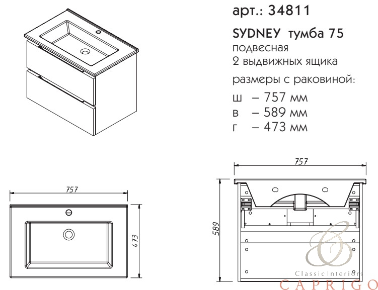 подвесная тумба SYDNEY 75 см выпускается в отделках: чистые эмали категория ЭМАЛИ – SPECIAL ENAMEL category реестра отделок CLASSIC раковина приобретается отдельно