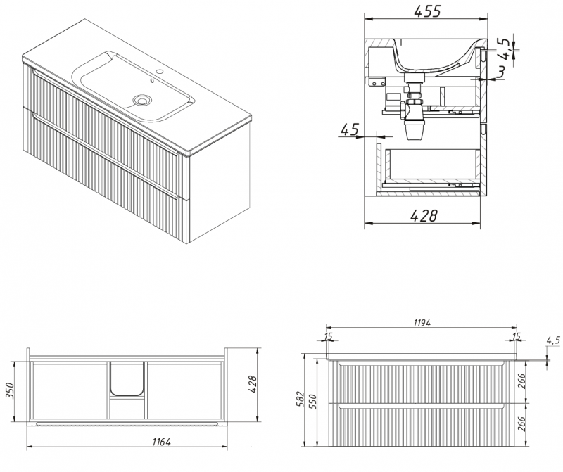| Габаритные размеры тумба + раковина, ш/г/в, в см: | 119,4/ 45,5/ 58 |