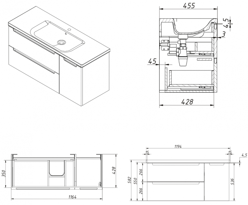 | Габаритные размеры тумба + раковина, ш/г/в, в см: | 119,4/ 45,5/ 58 |