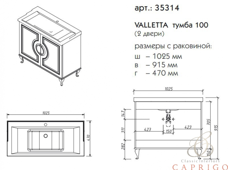 VALLETTA тумба 100 (2 двери) выпускается на склад в отделке арт. ТР-811 (Бланж). под заказ в отделках из Реестра отделок CONCEPT. раковина (фаянс) продается отдельно