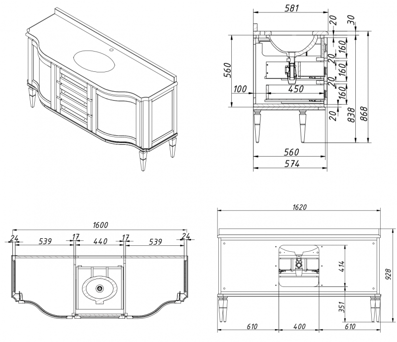 Тумба для столешницы 160см. Функционал - 2 выдвижных ящика и 2 двери. Выпускаются в эмалях из реестра отделок CLASSIC без патины. Варарианты раковин(фаянс)арт.: 0222WK; Сева DUO. Отдельно заказывается столешница.
