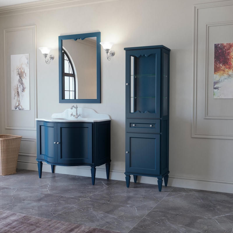 Пенал-витрина YORK выпускается в отделках категория ЭМАЛИ – SPECIAL ENAMEL category реестра отделок CLASSIC без патинирования один выдвижной ящик две стеклянные полки верхний фасад и боковины со стеклом